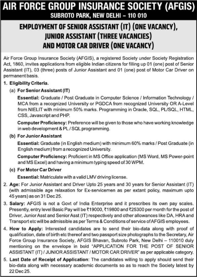 AFGIS Recruitment 2025 Notification And Application Form: The Air Force Group Insurance Society (AFGIS) has released the latest recruitment notification for the posts of Junior Assistant, Sr Assistant and Motor Car Driver. The offline application process has commenced from 04 December 2025. Eligible candidates can apply for these vacancies through the offline application form using the direct link given below.