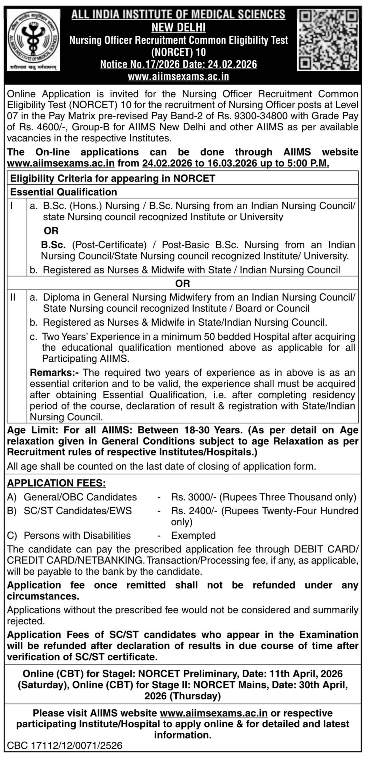 AIIMS NORCET 10 Recruitment 2026: The All India Institute of Medical Sciences (AIIMS) New Delhi has released the notification for the recruitment of Nursing Officers through the Nursing Officer Recruitment Common Eligibility Test (NORCET) 10. The AIIMS NORCET 10 Recruitment 2026 Short Notice has been released on 13 February 2026 and the online applications will be invited from 24 February to 16 March 2026. The eligible candidates will be able to apply online from the website aiimsexams.ac.in.