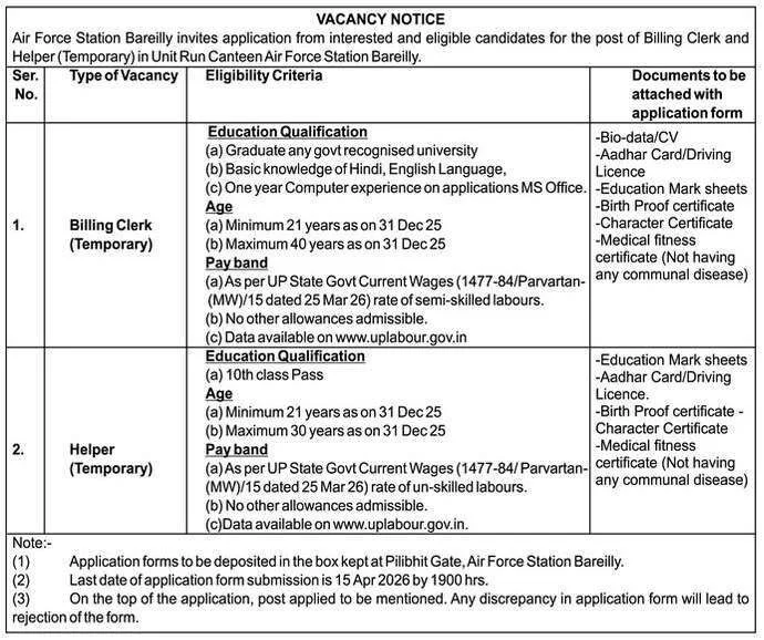 Air Force Station Bareilly Vacancy 2026 Indian Air Force Station, Bareilly has recently posted job openings for Billing Clerk, Helper. Online applications for the Air Force Station Bareilly Vacancy 2026 will be accepted starting 8 April, 2026, on the official website. If you are interested in this position and meet all the requirements, please submit your application.