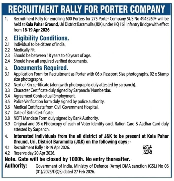 Army Porter Jammu and KashmirBharti 2026: The 275 Porter Company has released a notification for the recruitment of 600 Porters. The recruitment rally will be conducted at Kala Pahar Ground, Uri, District Baramulla (J&K) under HQ 161 Infantry Brigade. Interested and eligible candidates can participate in the rally from 18 April to 19 April 2026.