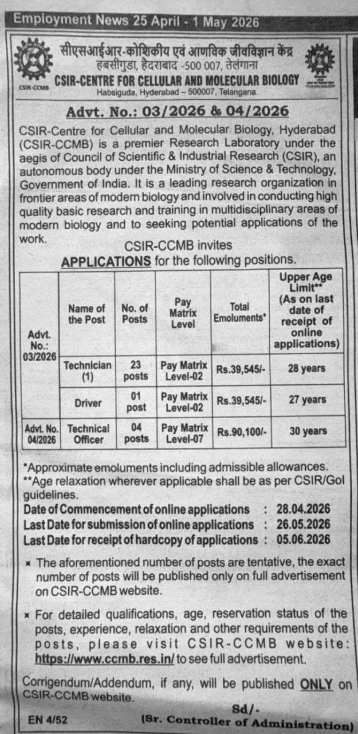 CSIR CCMB Recruitment 2026: CSIR-Centre for Cellular and Molecular Biology Recruitment 2026 notification has been released for 28 vacancies on Technician, Driver, and Technical Officer posts. The online application process will start from 28 April 2026 for eligible candidates. Applicants must have an age limit between 18 to 30 years as per the official guidelines. Interested candidates are advised to apply online through the official website before the last date. This is a great opportunity to join a prestigious research organization under CSIR.