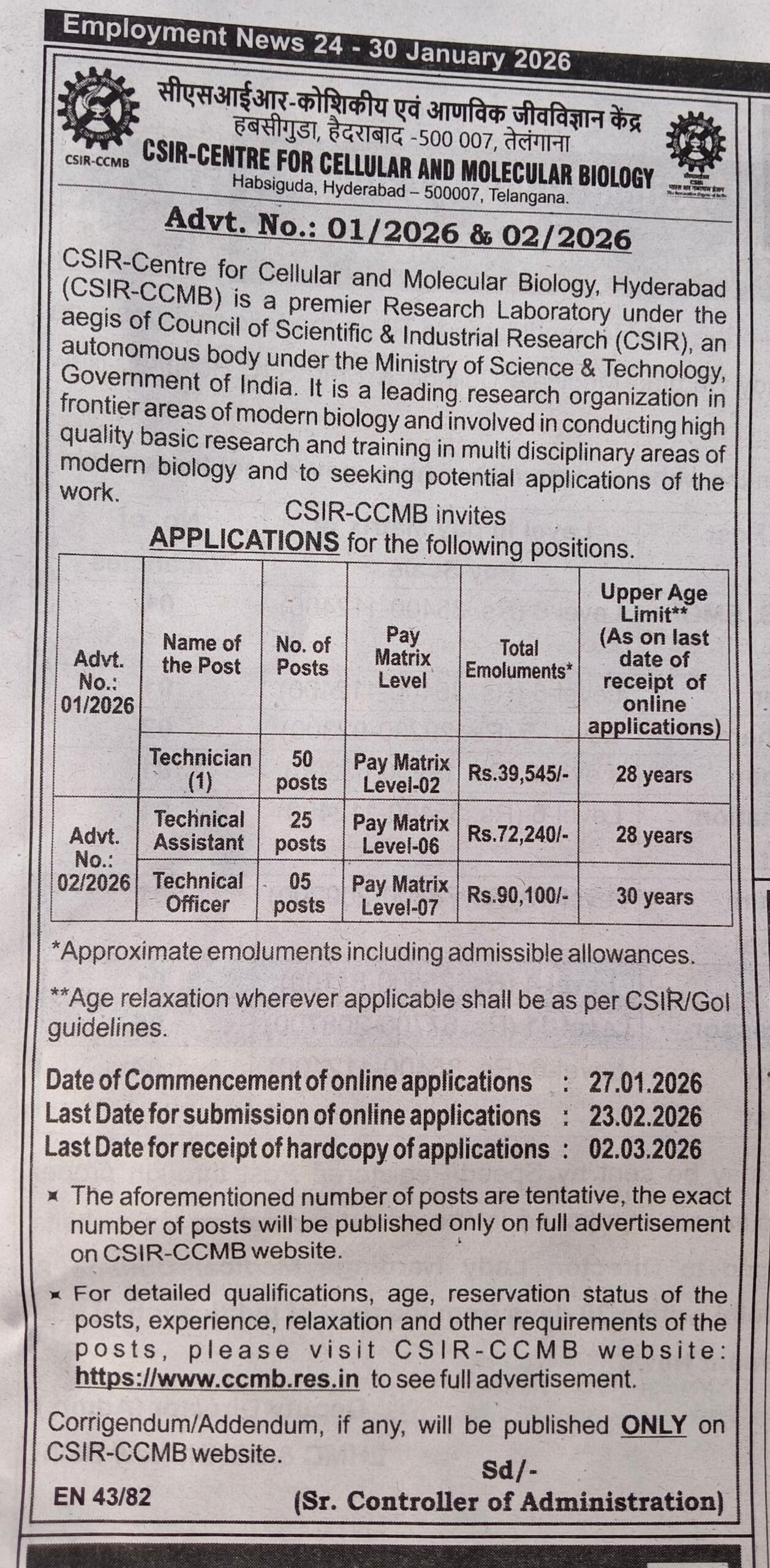 CSIR-CCMB is a premier research laboratory under the Council of Scientific & Industrial Research (CSIR), Government of India, functioning under the Ministry of Science & Technology. Eligible candidates can apply online from 27 January 2026, and the last date to submit the online application is 23 February 2026.
