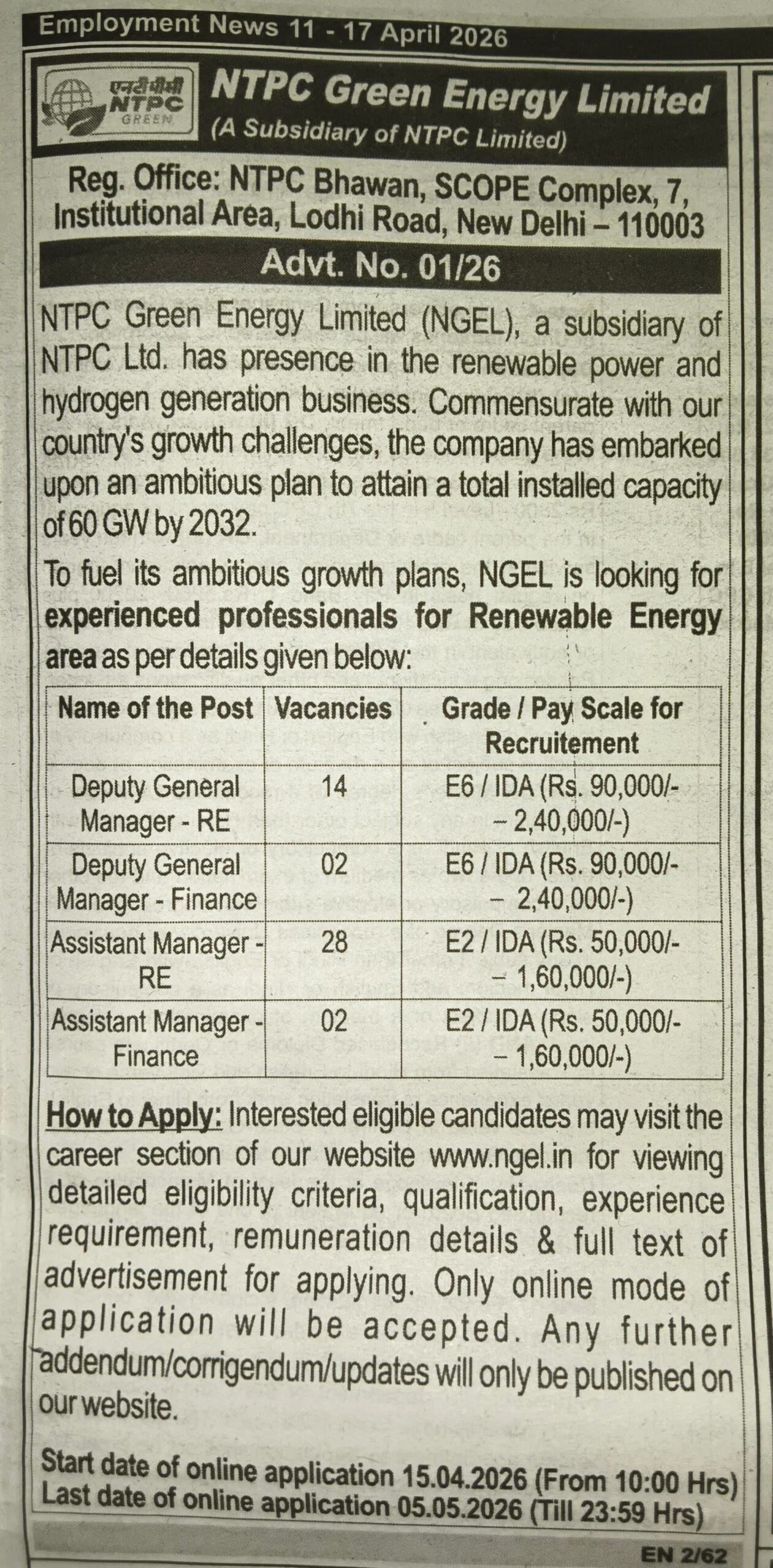 Delhi NGEL Recruitment 2026: The NTPC Green Energy Limited (NGEL) has released the Delhi NGEL Recruitment 2026 notification for 46 vacancies of Assistant Manager and Deputy Manager posts. The online application process will start from 15 April 2026 and will continue till 5 May 2026.