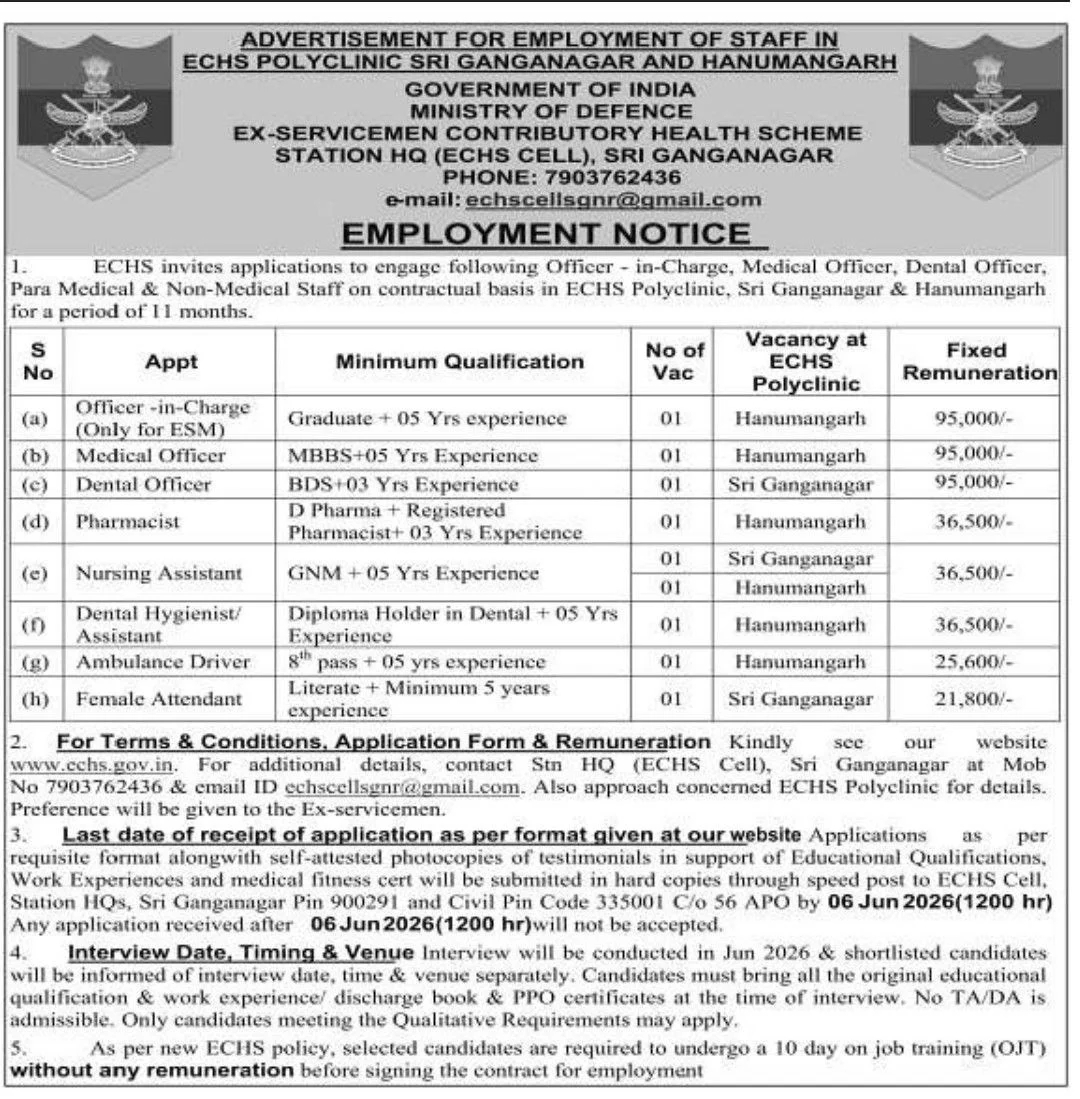 ECHS Sri Ganganagar Vacancy 2026: Ex-Servicemen Contributory Health Scheme (ECHS) Station HQ (ECHS Cell), Sri Ganganagar and Hanumangarh has recently posted job openings for Ambulance Driver and Female Attendant. Online applications for the ECHS Sri Ganganagar Vacancy 2026 will be accepted starting 18 April, 2026, on the official website (echs.gov.in). If you are interested in this position and meet all the requirements, please submit your application.