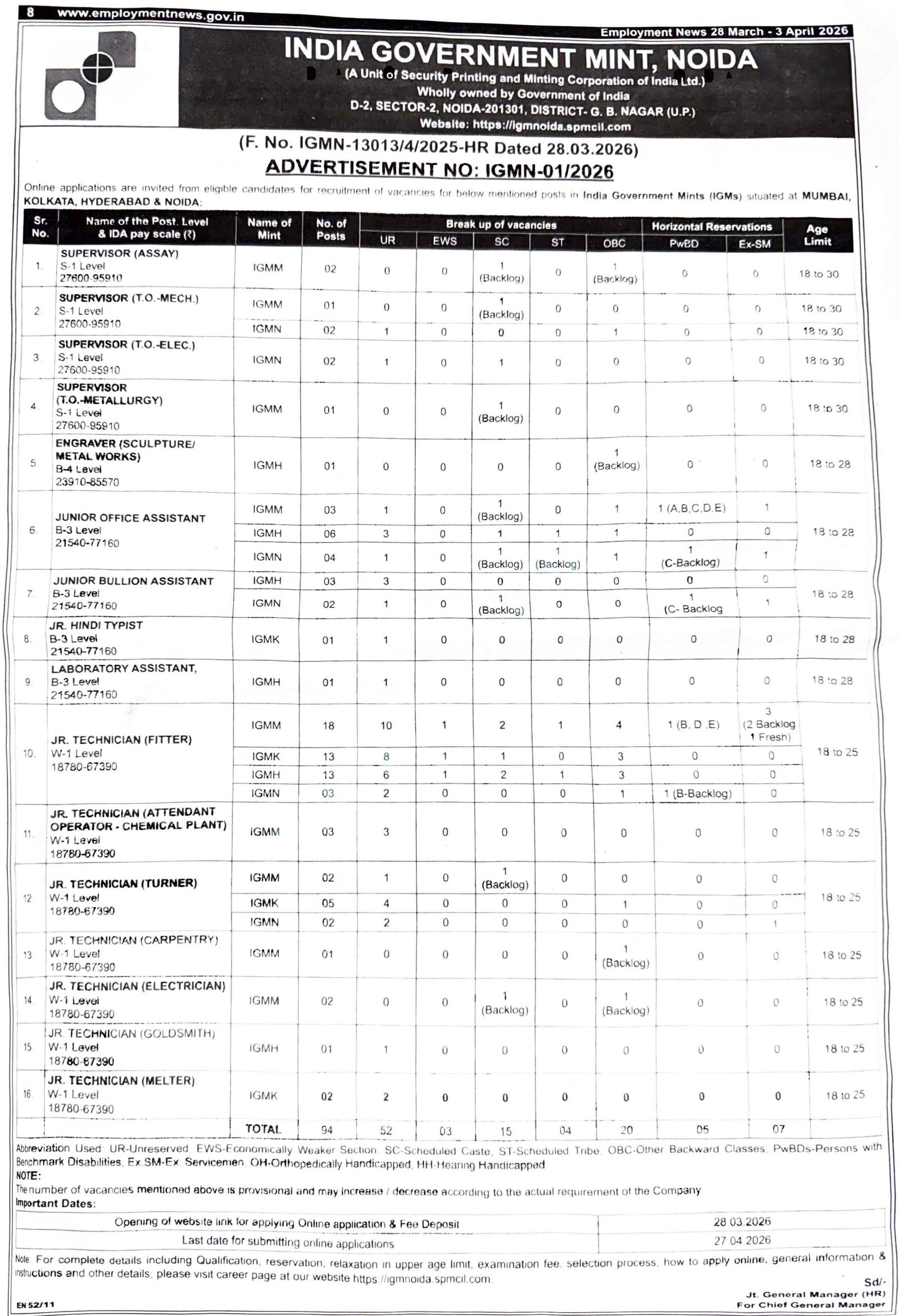 IGM Recruitment 2026: The India Government Mint has released the Recruitment 2026 notification for 90 posts. The online application process will begin on 28 March 2026 and will continue till 27 April 2026. Candidates aged between 18 to 30 years are eligible to apply for these posts. This recruitment provides a great opportunity for candidates seeking central government jobs. Interested applicants should check all eligibility details and apply online before the last date.