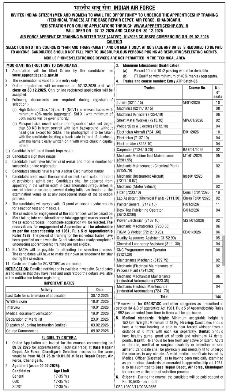 Indian Air Force Chandigarh Apprentice Recruitment 2025: Indian Air Force has released the latest notification for the Apprenticeship Training (Technical Trades) at Base Repair Depot, Air Force, Chandigarh. Eligible Indian citizens (Men and Women) can apply online for various technical apprentice trades. The online registration through www.apprenticeship.gov.in will start on 07 December 2025 and will remain open till 30 December 2025. The selection will be done strictly on merit basis without any influence, and no bribe is required to be paid to anyone.