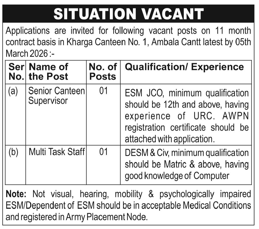 Kharga CSD Canteen 01, Ambala Cantt has recently posted job openings for Senior Canteen Supervisor and MTS Posts. Online applications for the Kharga CSD Canteen Ambala Vacancy 2026 will be accepted starting 25 February, 2026, on the official website. If you are interested in this position and meet all the requirements, please submit your application.