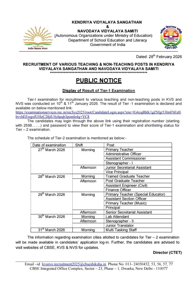 KVS and NVS Teaching and Non Teaching Tier-II Exam Date Notice
