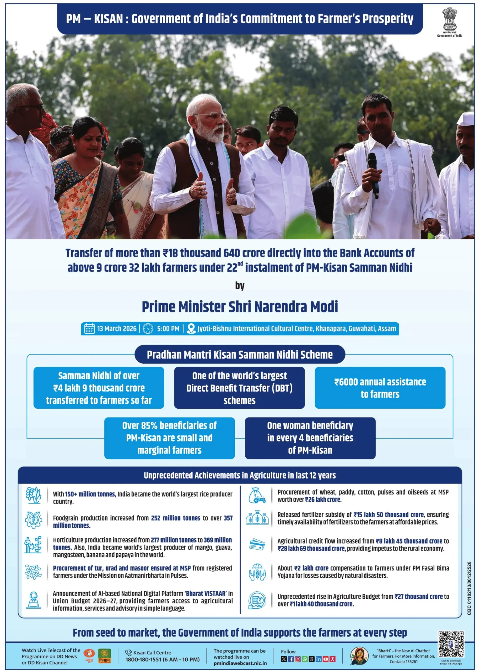 यह किस्त 13 मार्च 2026 को शाम 5:00 बजे प्रधानमंत्री द्वारा जारी की गई। इस अवसर पर असम के गुवाहाटी स्थित ज्योति-बिष्णु इंटरनेशनल कल्चरल सेंटर, खानापारा में एक कार्यक्रम आयोजित किया गया था, जहां से किसानों के खातों में यह राशि ट्रांसफर की गई।