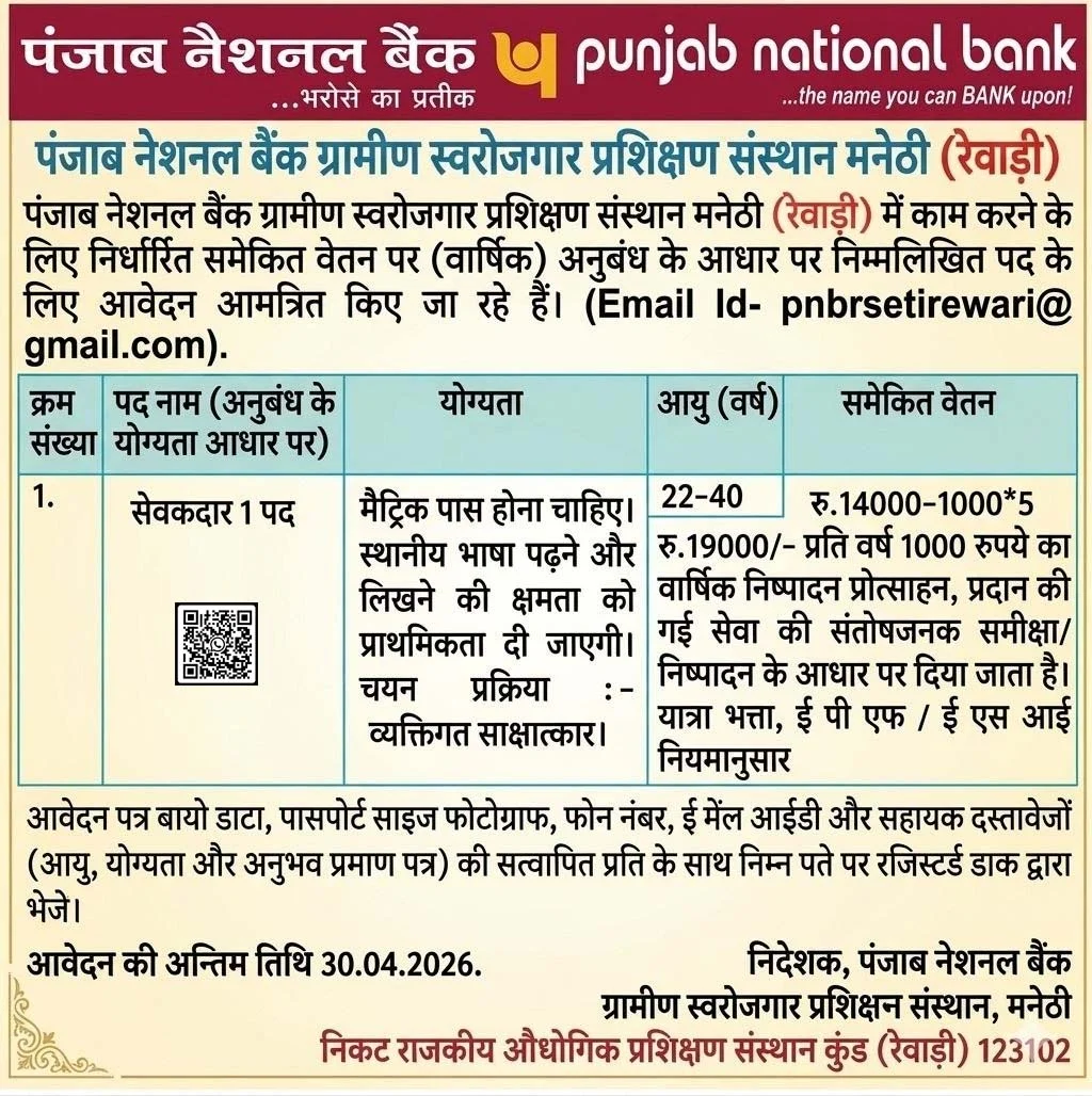 PNB Bank Rewari Recruitment 2026 Punjab National Bank’s Rural Self Employment Training Institute, RSETI has recently posted job openings for Peon posts. Online applications for the PNB Bank Haryana Vacancy 2026 will be accepted starting 11 April, 2026, on the official website. If you are interested in this position and meet all the requirements, please submit your application.