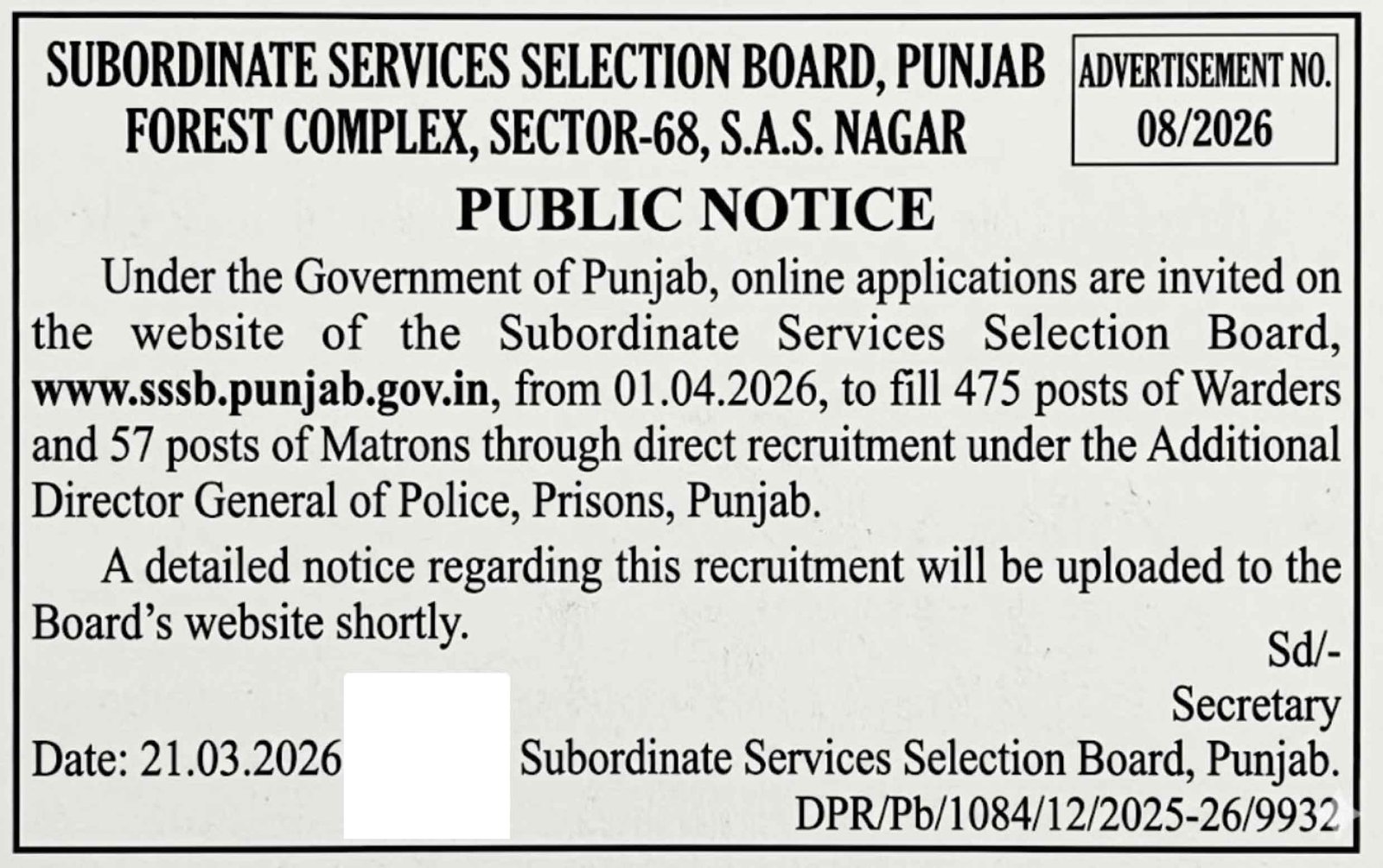 PSSSB Punjab Jail Warder and Matron Recruitment Advt 08/2026: Punjab Subordinate Services Selection Board (PSSSB) has released a short public notice for Jail Warder and Matron recruitment under the Punjab Prisons Department through the Advt. No. 08/2026. This recruitment will be conducted under the Additional Director General of Police, Prisons, Punjab. As per the official notice, a total of 475 Warder (Male) posts and 57 Matron (Female) posts will be filled through this recruitment drive. The PSSSB Punjab Jail Warder and Matron Recruitment 2026 Short Notice has been released on 28 March 2026.
