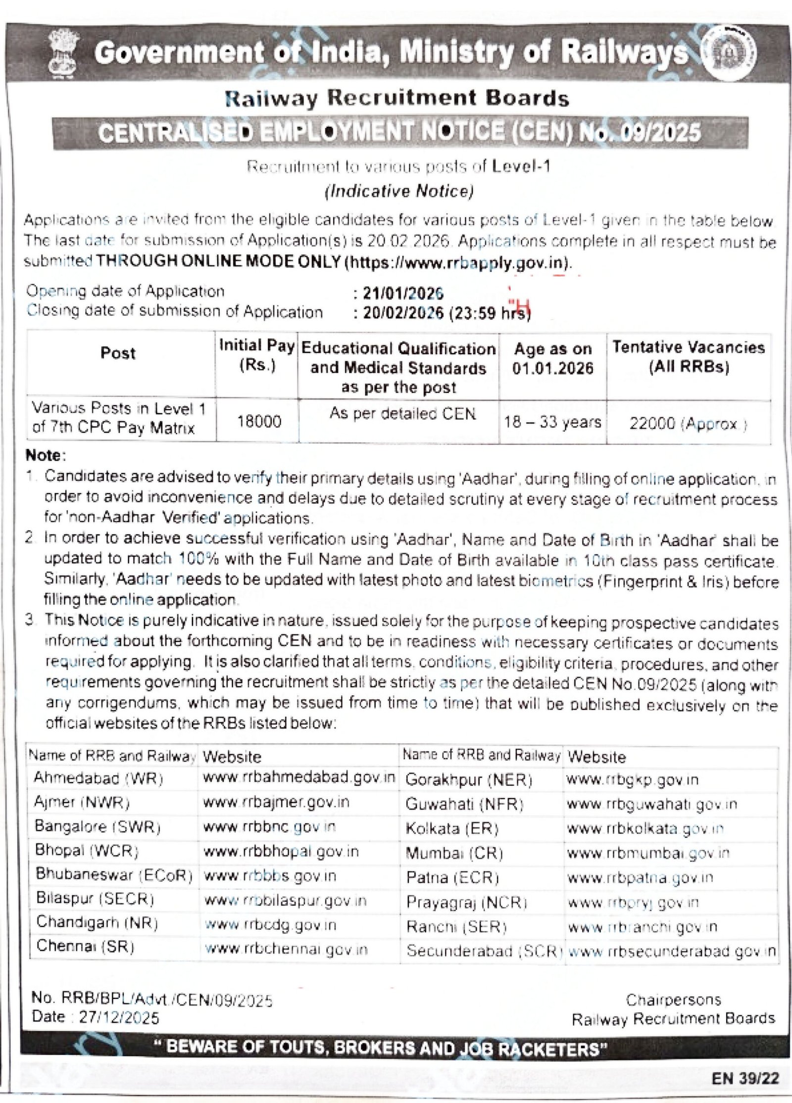 | RRB Group D CEN 09/2025 Apply Date Notice | Date Notice |
