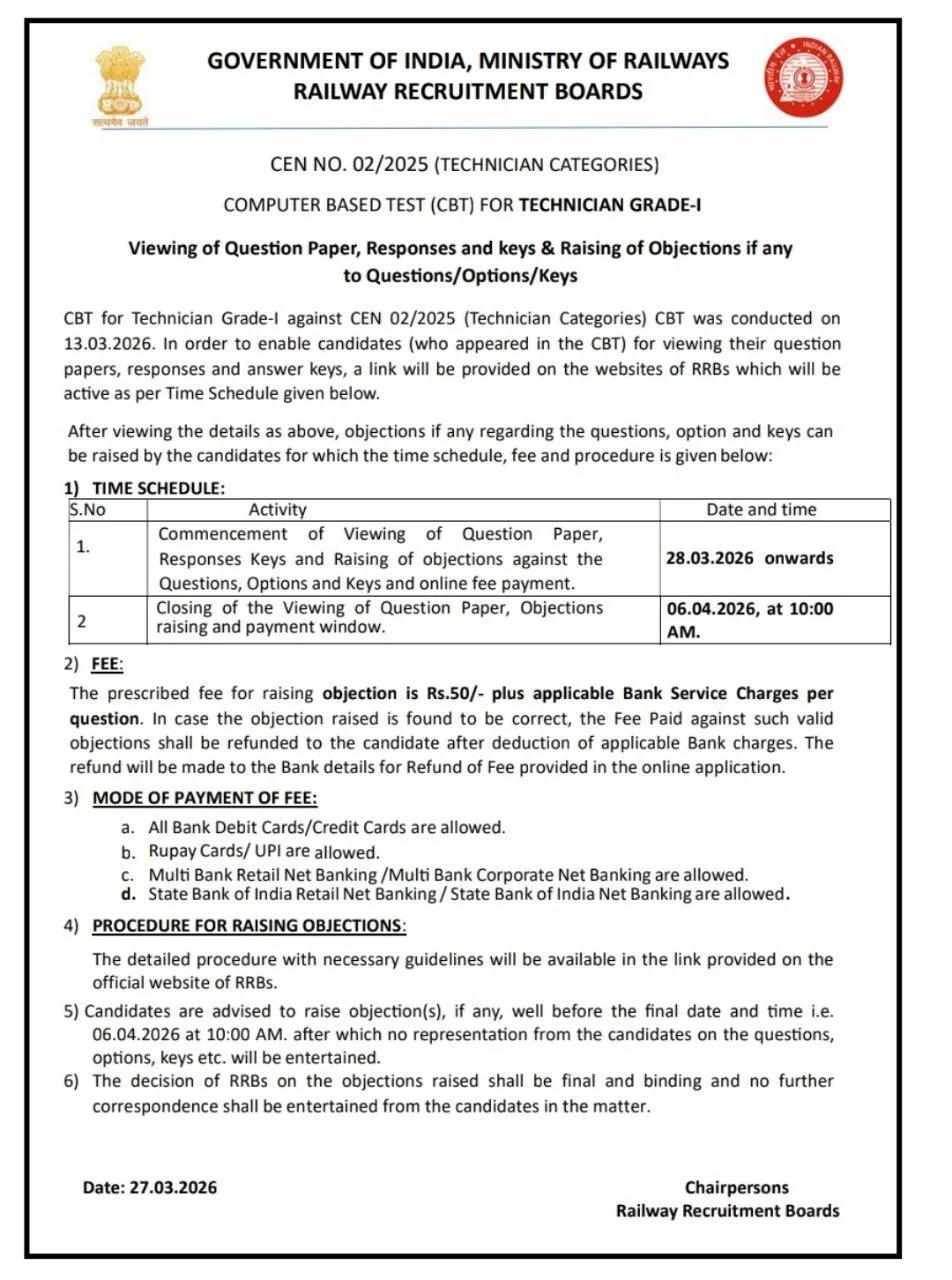 RRB Technician CEN 02/2025 Answer Key Link (Grade-I)