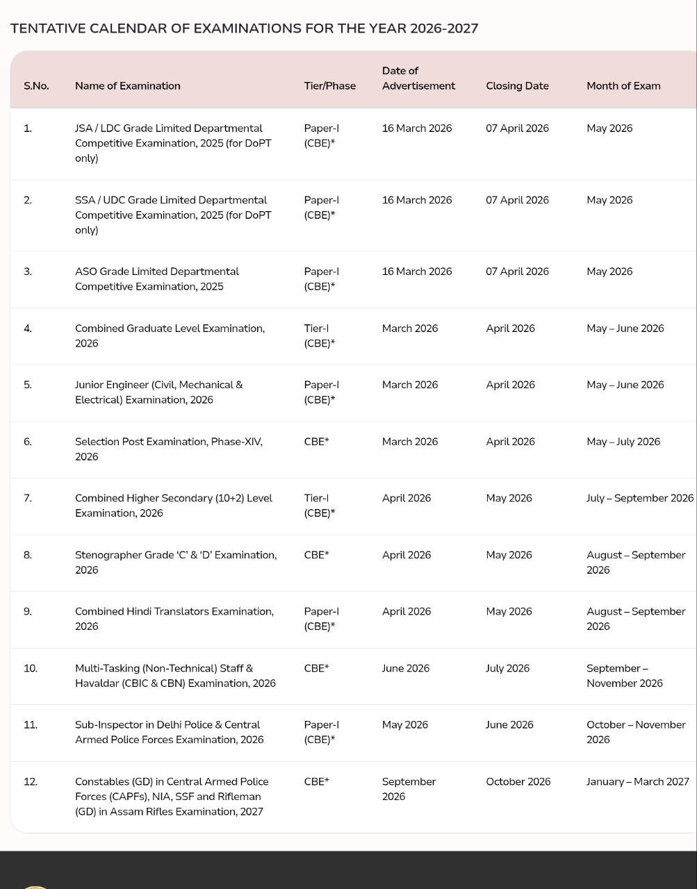 The Staff Selection Commission (SSC) has released the tentative examination calendar for the year 2026–27, covering major recruitment exams such as CGL, CHSL, JE, MTS, CPO, GD Constable, Stenographer, and departmental examinations. According to the calendar, most notifications will be released between March and September 2026, while examinations are scheduled from May 2026 to March 2027. All major exams will be conducted in Computer Based Examination (CBE) mode. Candidates preparing for SSC exams should carefully note the advertisement dates, application closing dates, and exam months to plan their preparation effectively.