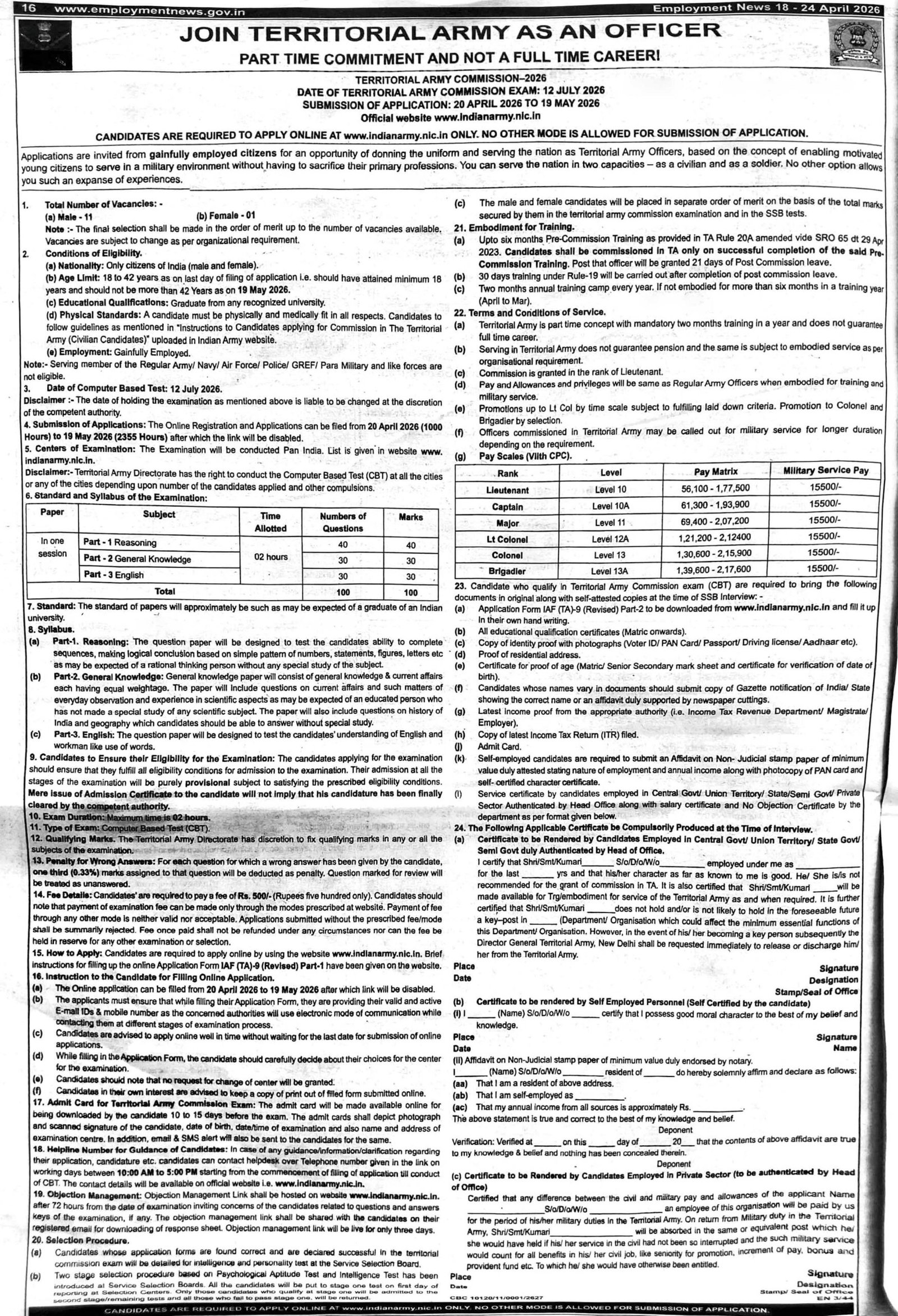 | Territorial Army Officer Recruitment 2026 Online Form (From 20.04.2026) | Apply Online |